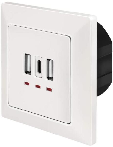Végre nincs több USB-adapter az aljzathoz: Egyszerűen csatlakoztassa a kívánt eszközt az aljzatba USB-kábellel, és máris töltheti. Egyszerre akár három készülék is tölthető. Ideális szállodai szobákba, éttermekbe, irodákba vagy otthoni használatra. Töltsön egyszerre 3 USB-eszköztBemenet: 230 V AC, 50 HzKimenet: 2x USB-A: 5V/2.4A (max. 12W) + 1x USB-C: 5V/3A (max. 15W)LED-ek a tevékenység jelzéséreTápellátás mobiltelefonokhoz és egyéb elektromos készülékekhezStandard méretű német süllyesztett dobozKönnyen telepíthetőSzín: fehér